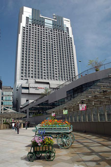 "Applause Tower" + Güterzug im Bahnhof Umeda