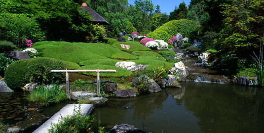 Bepflanzungen, Wege, Felsen und Steinlaternen vervollständigen den