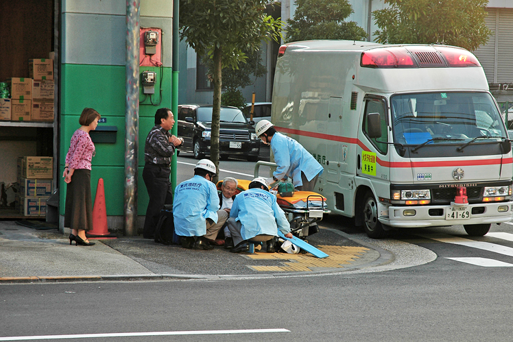 Sanitäter kümmern sich um einen auf der Straße sitzenden Passanten