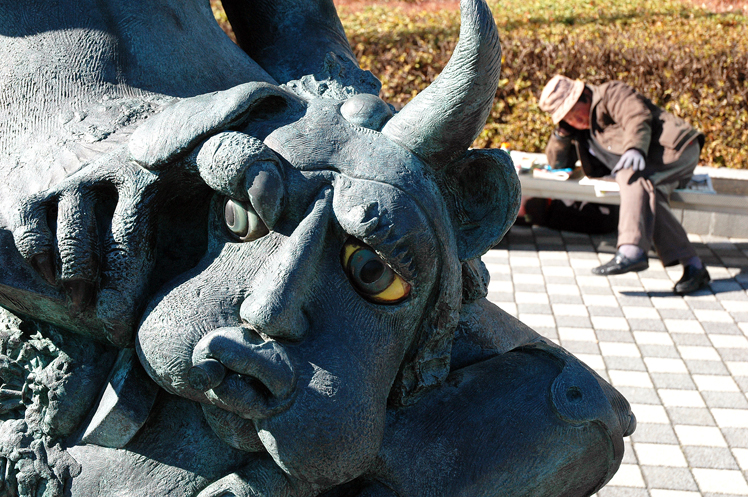 Die Skulptur "Tele Party" und der lesende Mann auf der Bank