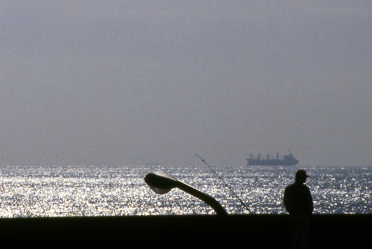 Die Silhouetten des Anglers und eines vorbeiziehenden Tankers