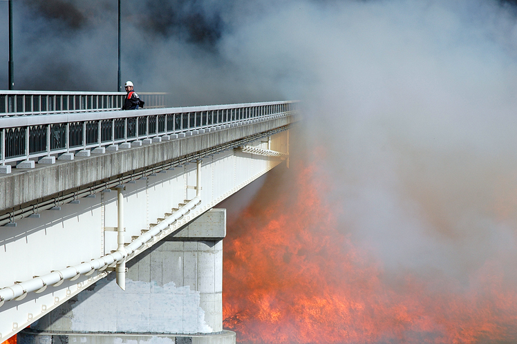 Der Feuerwehrmann auf der Brücke und das Feuer darunter