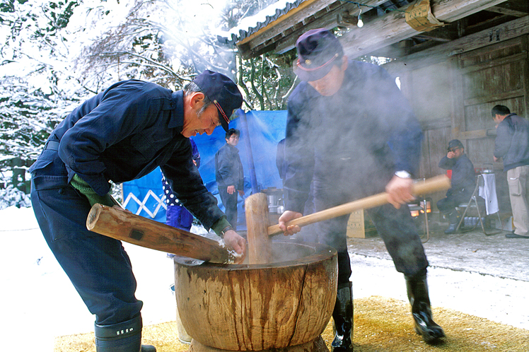 Das Feuerwehrteam, das den Reis für Neujahr zu Brei stampft