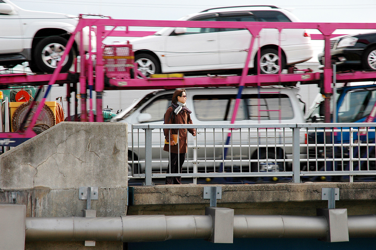 Die Frau auf der Brücke und der Autotransporter